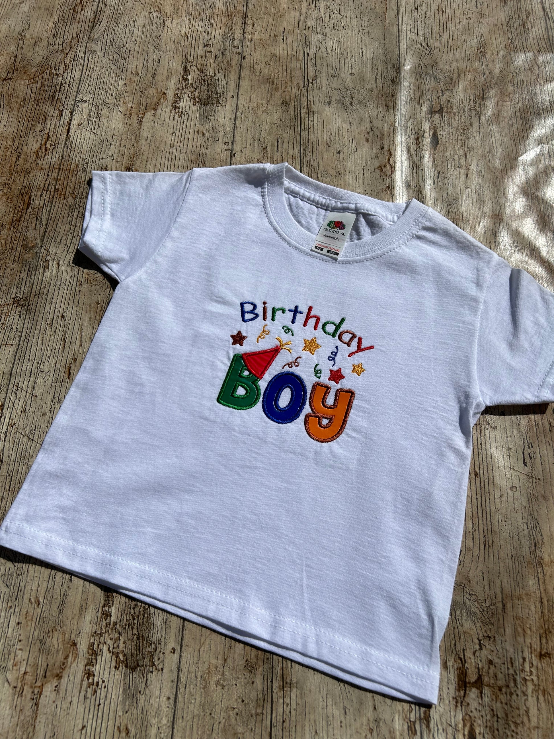 Children's t-shirts with embroidered Birthday Boy to make the little guy smile on his birthday.
