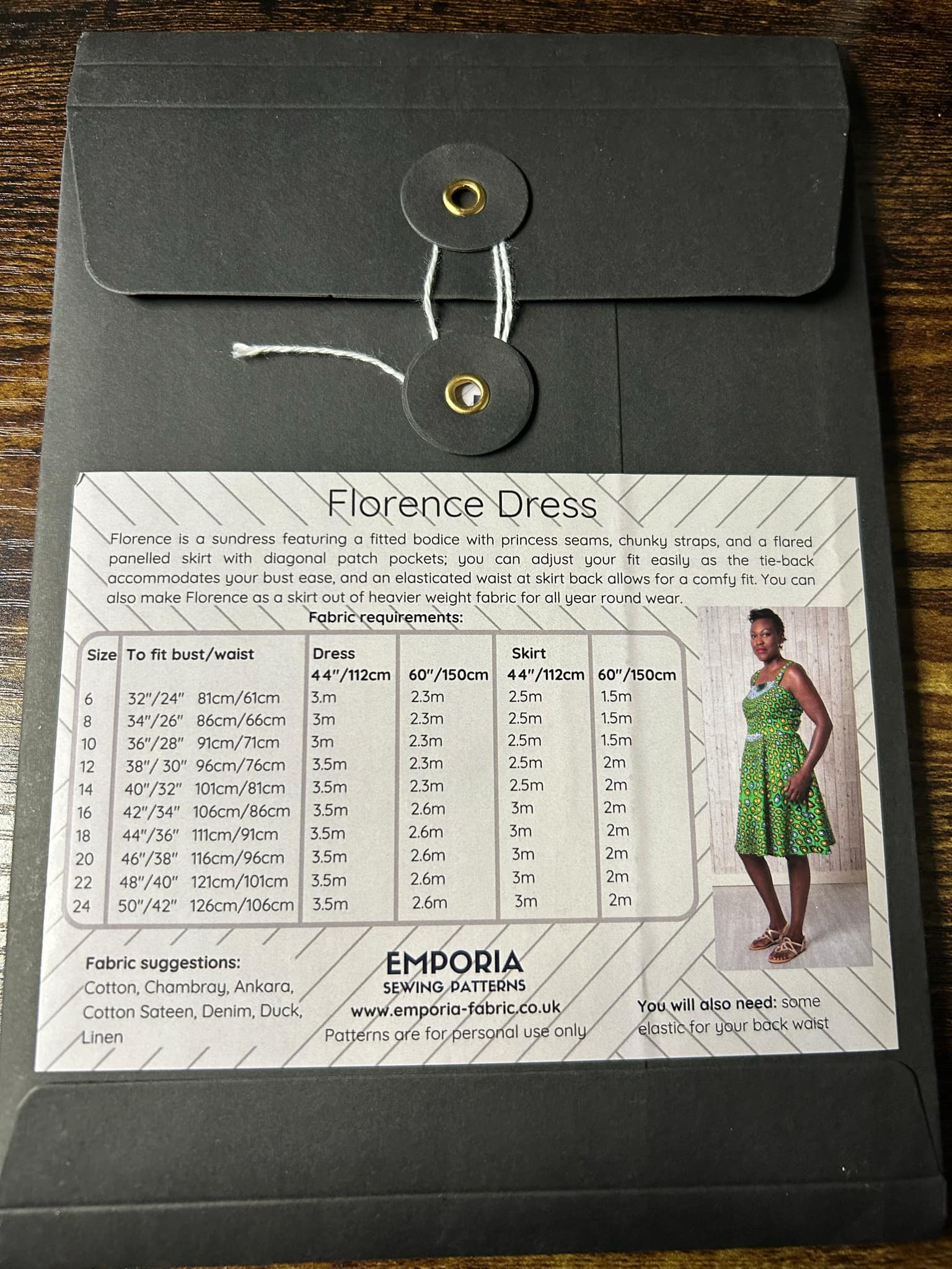 It’s designed to be made from cotton and medium weight fabrics that have some structure. Ankara or African wax is ideal as it holds the shape of the skirt perfectly, while also being soft enough and cool enough for a lined bodice.