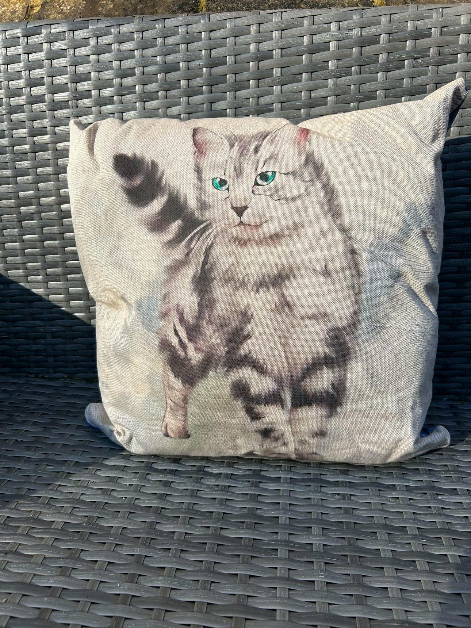 Beautiful grey cat with piercing green eyes cushion perfect for any room.